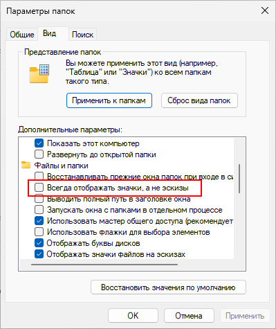 Как в Проводнике Windows 11 отключить показ эскизов только для папок