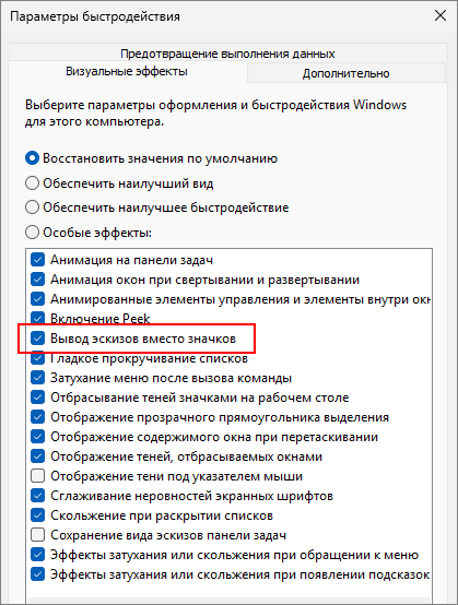 Эту же настройку вы найдете в окне параметров производительности системы, там она имеет название «Показывать миниатюры вместо значков».
