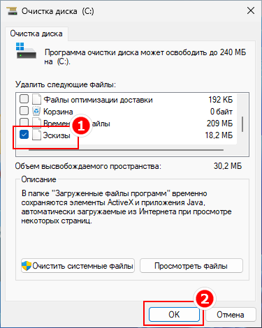 Для этого запустите командой cleanmgr утилиту очистки диска, выберите диск C и нажмите «OK». Отметьте в открывшемся окошке пункт «Миниатюры» и нажмите «OK».
