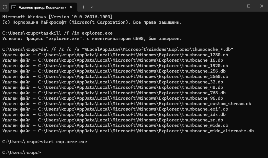 del /f /s /q /a «%LocalAppData%MicrosoftWindowsExplorerthumbcache_*.db»