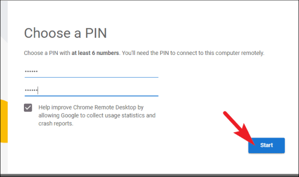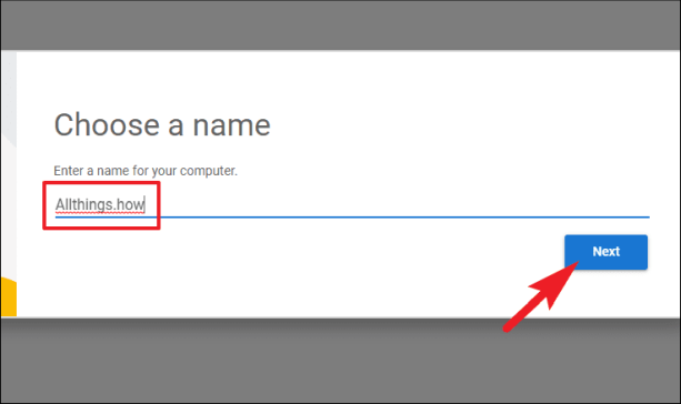Как только установка завершится, на вашем экране откроется окно Chrome. Затем введите имя ПК в предназначенное для этого поле и нажмите кнопку «Далее», чтобы продолжить.
