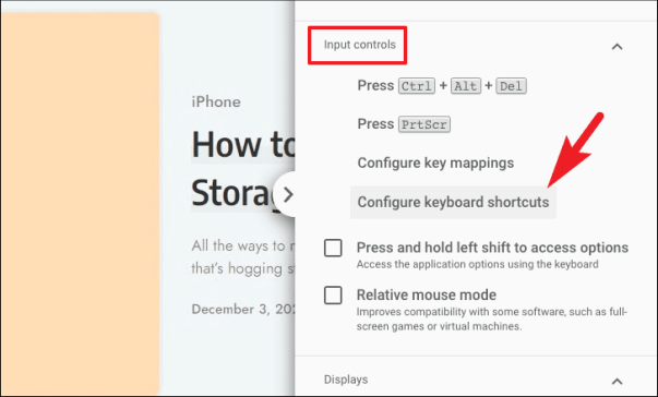 Чтобы настроить ярлыки для сеанса, прокрутите вниз до раздела «Управление вводом». Затем нажмите на опцию «Настроить сочетания клавиш». На вашем экране откроется область наложения.