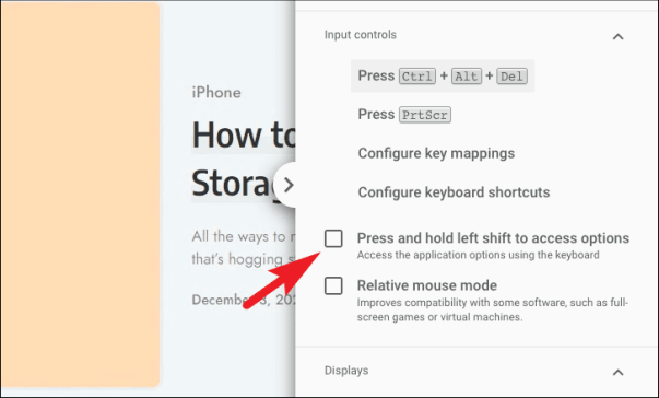Если вы хотите быстро получить доступ к настройкам сеанса с помощью сочетания клавиш, установите флажок перед «нажмите и удерживайте левый переключатель для доступа к параметрам». Затем, если вы используете виртуальные машины на своем удаленном компьютере или тестируете приложение с интенсивной графикой, установите флажок перед параметром «Режим относительной мыши».