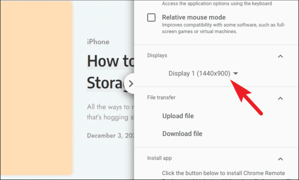Если вы хотите спроецировать отображение удаленного подключения на дополнительный экран, найдите раздел «Дисплеи». Затем щелкните раскрывающееся меню и выберите подключенный дисплей.
