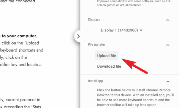 Если вы хотите отправить файл на удаленный компьютер или загрузить файл на свой компьютер, найдите на панели раздел «Передача файлов». Затем, чтобы отправить файл, нажмите на опцию «Загрузить файл» или нажмите U клавишу после нажатия клавиши-модификатора для сочетаний клавиш и выберите файл для отправки с помощью проводника на вашем компьютере. Точно так же нажмите на опцию «Загрузить файл» или нажмите D клавишу после нажатия клавиши-модификатора и найдите файл с помощью проводника, чтобы получить файл с удаленного компьютера.