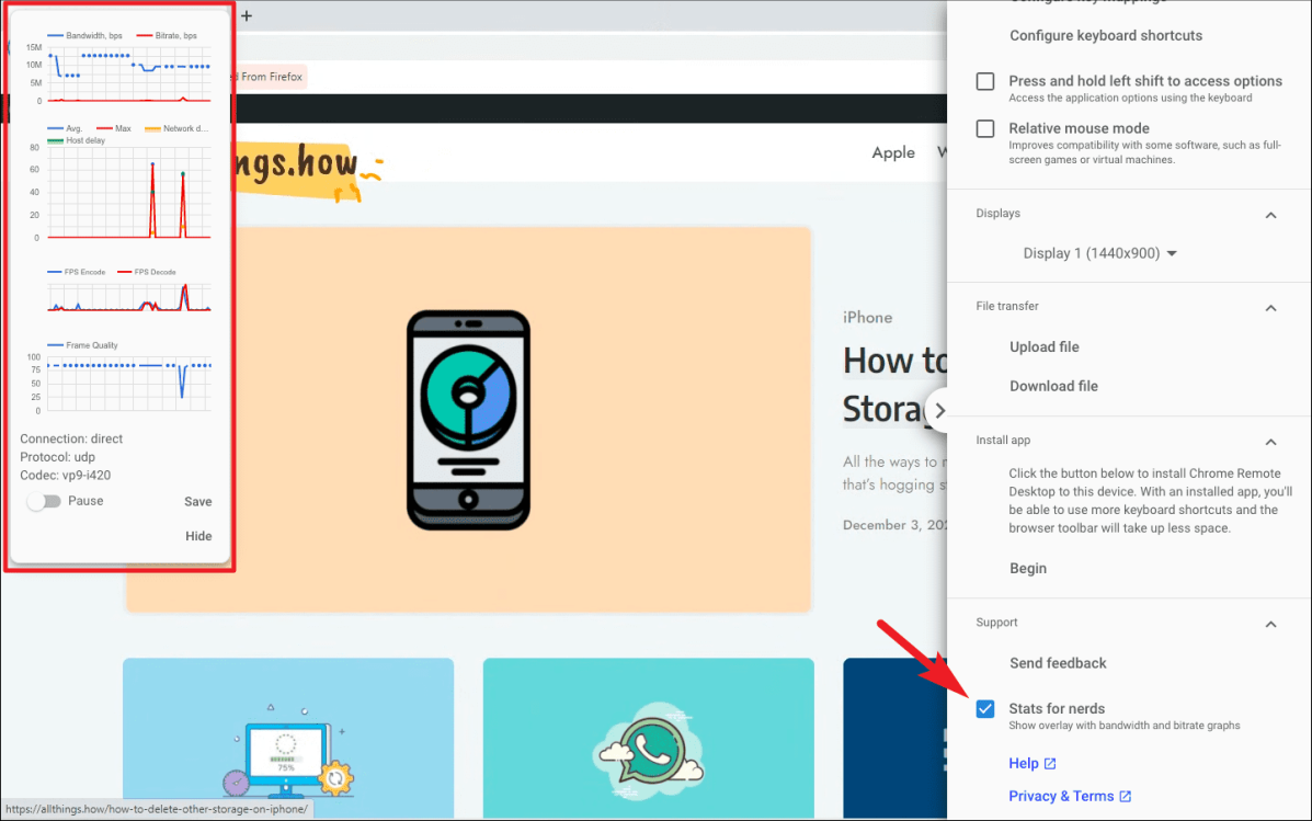 Вы также можете включить статистику, такую как пропускная способность, битрейт, качество кадра, текущий используемый протокол, кодек, задержка хоста, сетевая задержка, установив флажок перед параметром «Статистика для ботаников» в разделе «Поддержка».