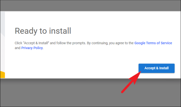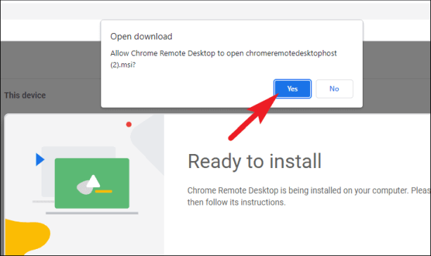 После загрузки файла вернитесь на веб-страницу удаленного рабочего стола Chrome и нажмите кнопку «Принять и установить», чтобы установить программное обеспечение на свой компьютер. Это вызовет подсказку на вашем экране.