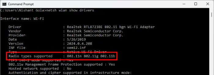 Найдите строку Radio types supported — если там указано 802.11be, значит адаптер технически поддерживает Wi-Fi 7.