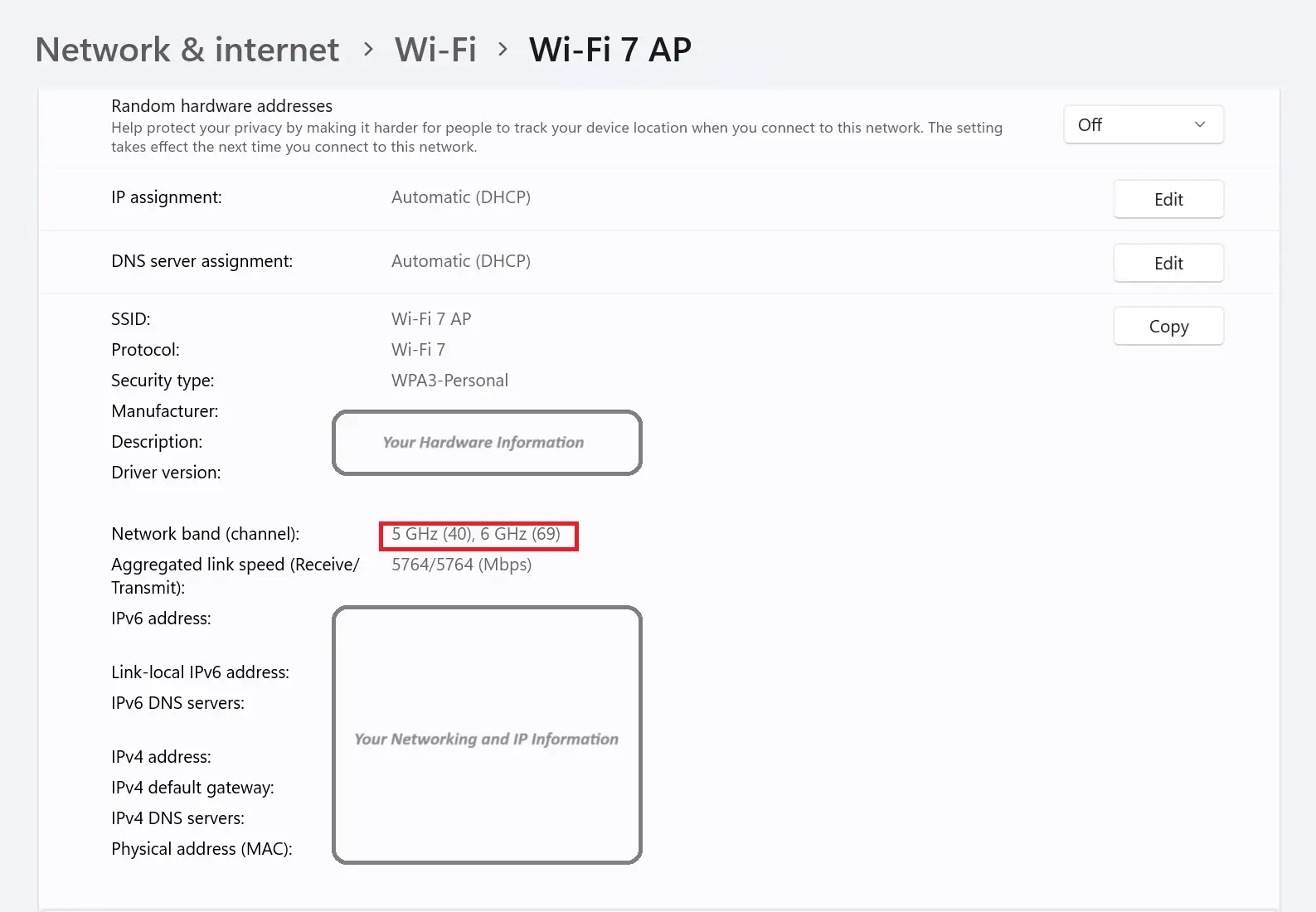 4. Посмотрите настройки соединения: после подключения к сети Wi-Fi 7-роутера перейдите в «Настройки → Сеть и Интернет → Wi-Fi → свой подключённый Wi-Fi-сеть → Свойства». В поле «Протокол» должно быть что-то вроде Wi-Fi 7 / 802.11be, либо упоминается EHT.