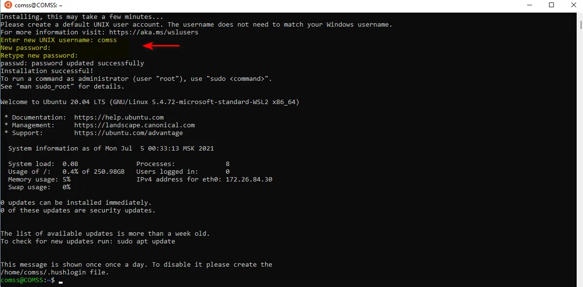 После перезагрузки продолжится установка Ubuntu 20.04 LTS (актуальная версия на момент статьи), с запуском начальной конфигурации. Здесь потребуется задать имя пользователя и пароль.