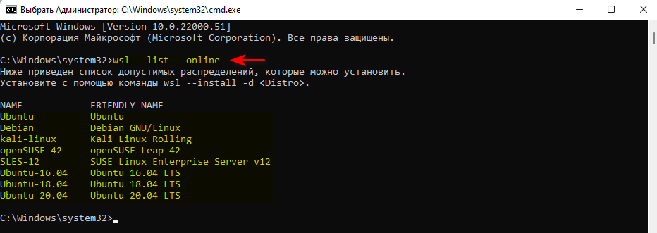 2. В Командной строке или Windows Terminal введите название дистрибутива, например: