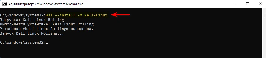 После выбора дистрибутива (например, Kali Linux) выполните: