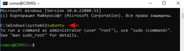 3. Введите команду wsl для запуска дистрибутива по умолчанию. Если установлено несколько, укажите, например: