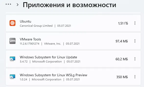 Если Linux больше не нужен, удалите Windows Subsystem for Linux Update и Windows Subsystem for Linux Update WSLg Preview.