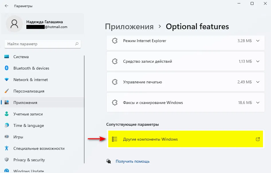 – Параметры > Приложения > Дополнительные возможности > Другие компоненты Windows.