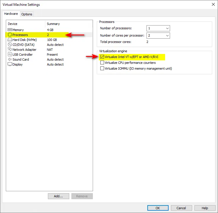 3. В разделе Оборудование > Процессоры установите флажок Виртуализировать Intel VT-x/EPT или AMD-V/RVI.